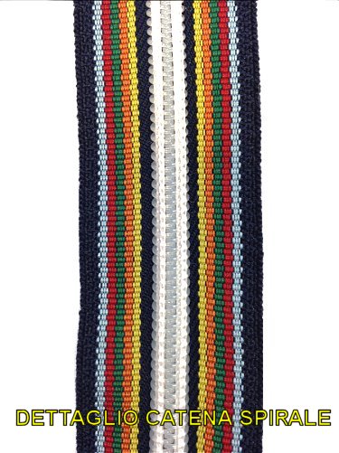 Chiusura lampo a spirale divisibile doppio cursore NON REVERSIBILE lunga 85 cm. con parte in tessuto multicolor. PER AVERE MISURE INFERIORI IN FASE DI MONTAGGIO SI ADATTA LA MISURA PIEGANDO LA PARTE SUPERIORE E TAGLIANDO L' ECCESSO OLTRE I 2/3 CM.