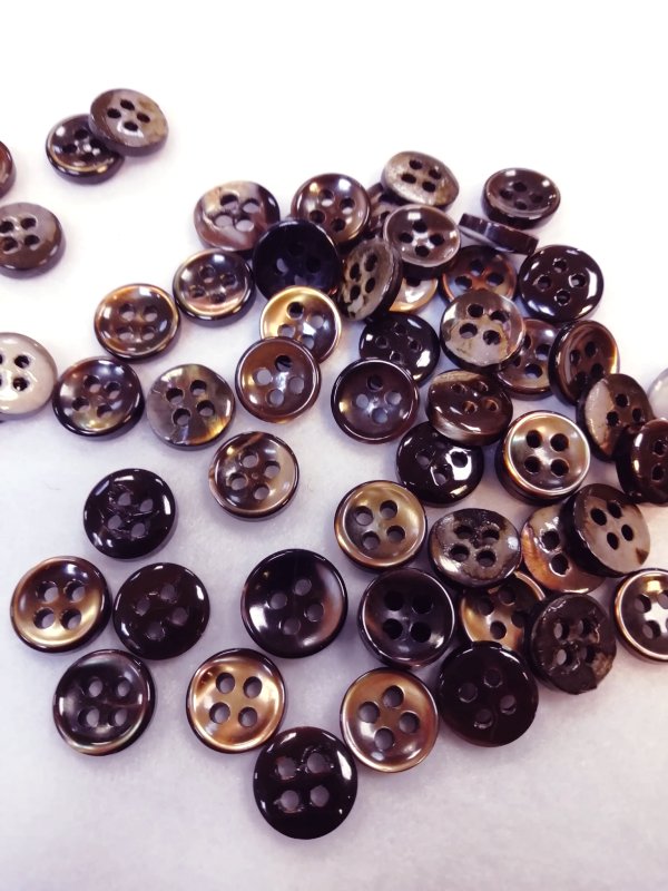 Bottoni in madreperla trocas colorata nero e marrone per camiceria da uomo. Modello VIENNA a 4 fori nelle misure lineato 16 - 18 con spessore tra i 2,3 e 3 mm. disponibile in singole unità o conf. da 72 pz.(1/2 grossa) a prezzo scontato.
