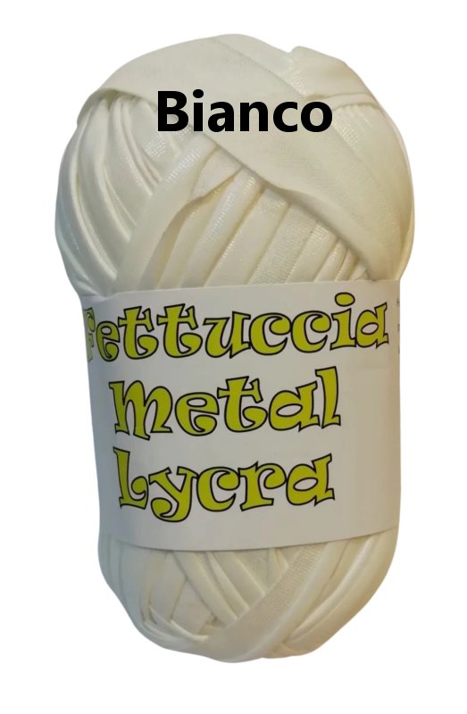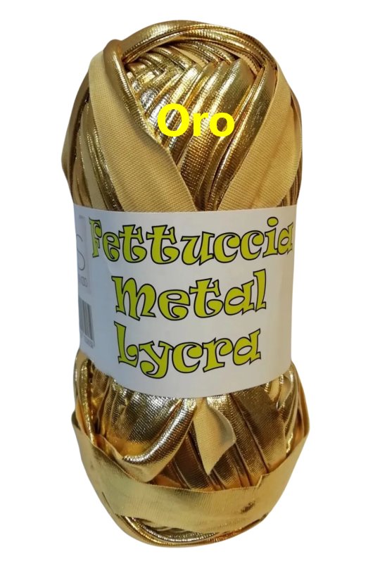 Fettuccia Metal Lycra da lavorare ad uncinetto in confezione da 100 grammi, circa 45 metri. Articolo acquistabile solo in negozio. Composizione: 95%poliest5%elastam.