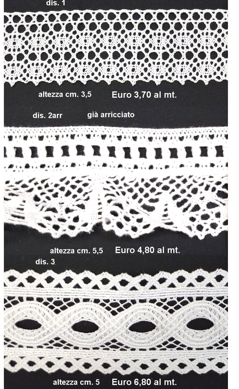 Pizzi all' uncinetto fatti a mano e pizzi tipo tombolo, tutti in puro cotone, di diverse altezze e con disegno a punta o a tramezzo da inserire tra due tessuti. Adatti per guarnire tende, tovaglie, capi di abbigliamento, e molto altro.
