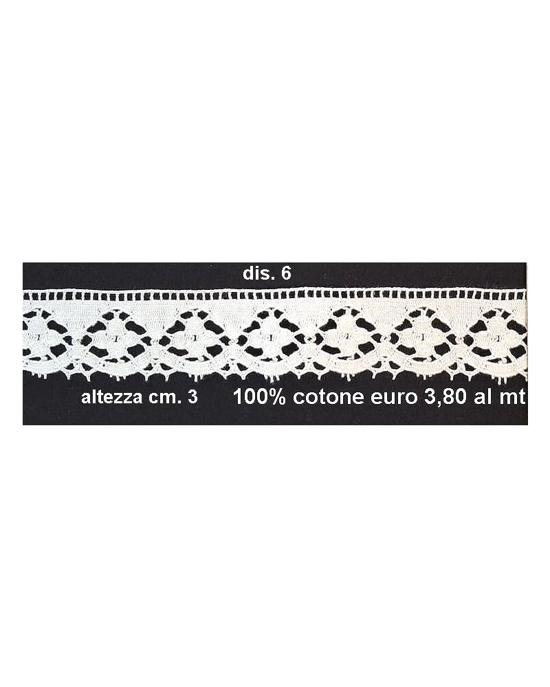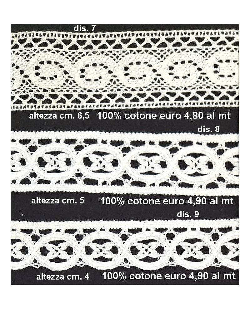 Pizzo tipo tombolo in puro cotone, diverse altezze e con disegno a punta o tramezzo da inserire tra due tessuti.