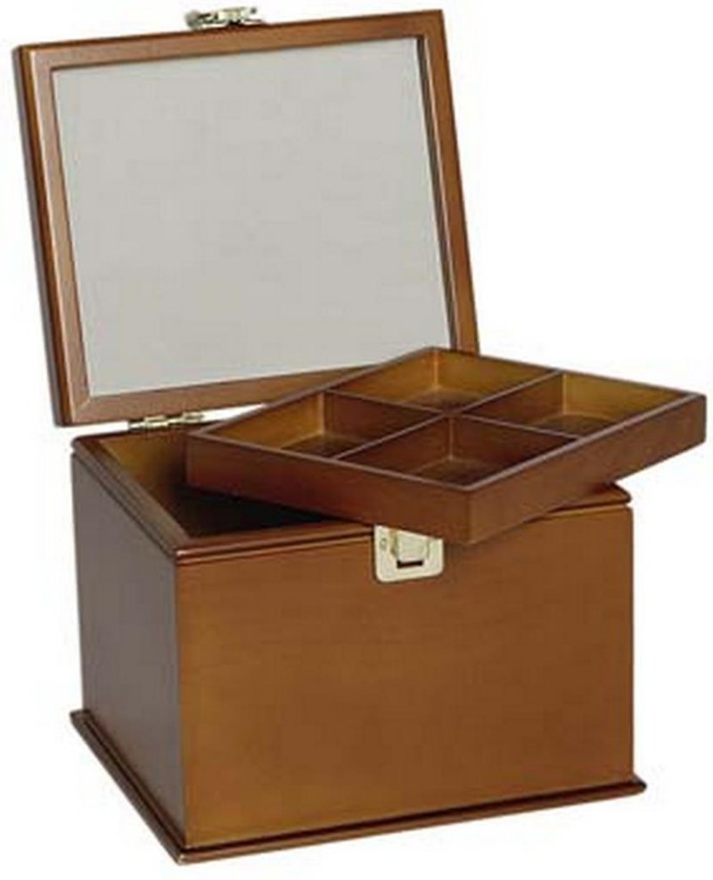 Box porta lavoro in legno noce scuro, misura 19x16,5x19, molto resistente, adatto per accessori di cucito, ricamo, patchwork e hobby vari. Dispone all'interno di un divisorio in legno dotato di comode vaschette per minuterie, bottoni, aghi, ecc. il coperchio è nella parte esterna foderato di cotone zephir a quadretti bianco/rosso.