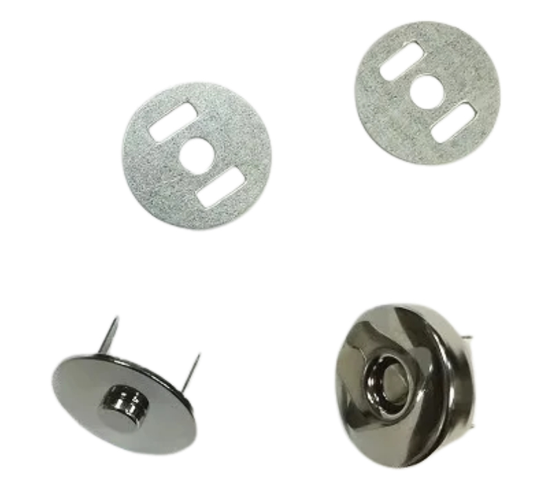 Bottoni magnetici da ribattere o da cucire, adatti per borse artigianali in fettuccia, feltro, tessuto, maglia o altro. Di facile applicazione, ogni magnete da ribattere è formato da quattro pezzi, da due quelli da cucire
