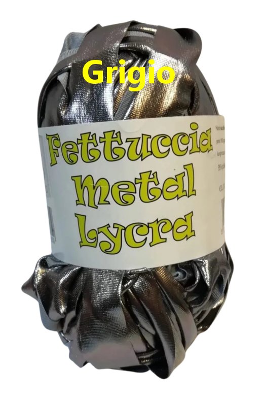 Fettuccia Metal Lycra da lavorare ad uncinetto in confezione da 100 grammi, circa 45 metri. Articolo acquistabile solo in negozio. Composizione: 95%poliest5%elastam.